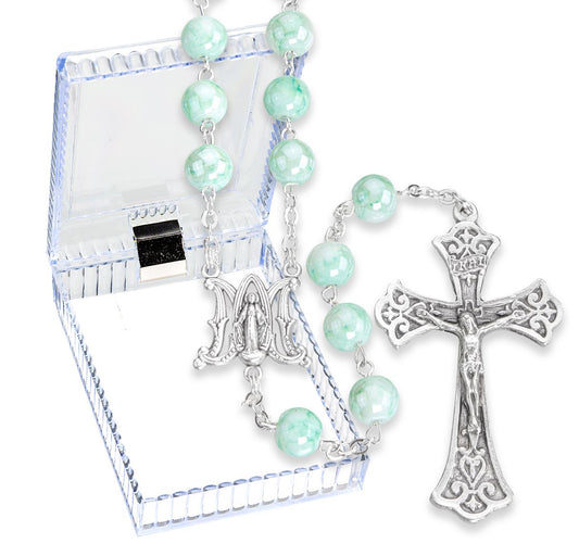 8mm Spotted Blue Dyed Stone Bead Rosary with Ave Maria Center and Crucifix, Boxed