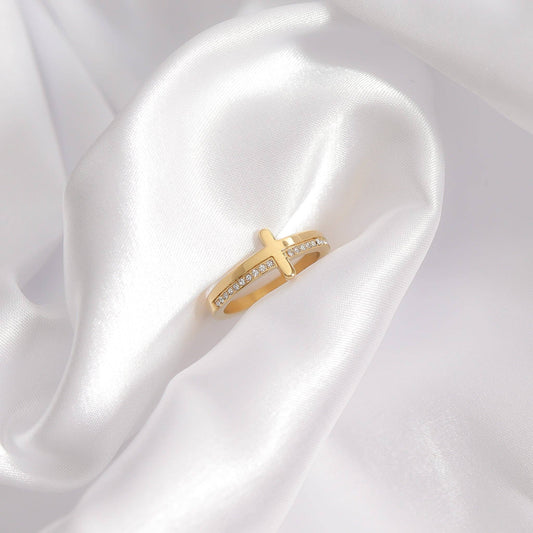 18K Gold PVD Engraved CZ Cross Stacking Ring