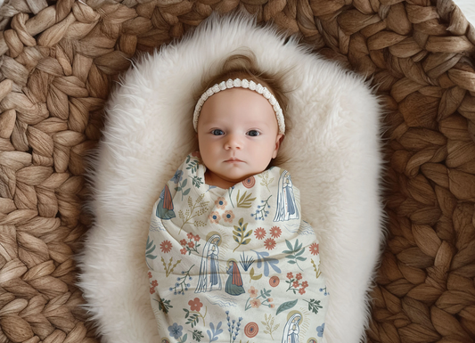 Our Lady of Lourdes and St. Bernadette Muslin Beige Swaddle