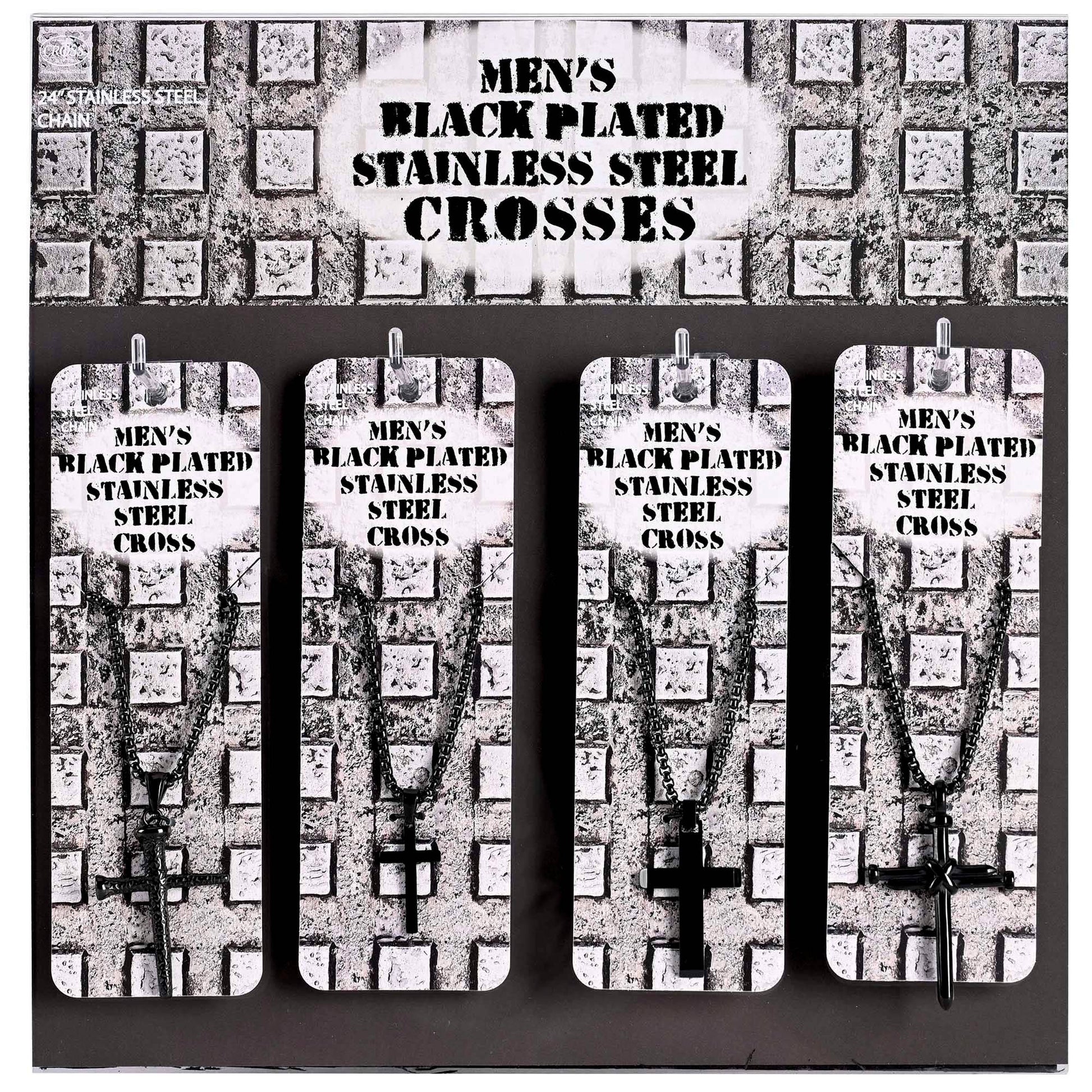 Assortment Of Mens Black Plated Stainless Steel Cross Necklaces, All On 24 Inch Pearl Chains With Lobster Claw Clasps. 4 Of Each Style Of Cross In This Assortment. Each Necklace Comes Carded, And The Assortment Includes A Free Short FGM Board.