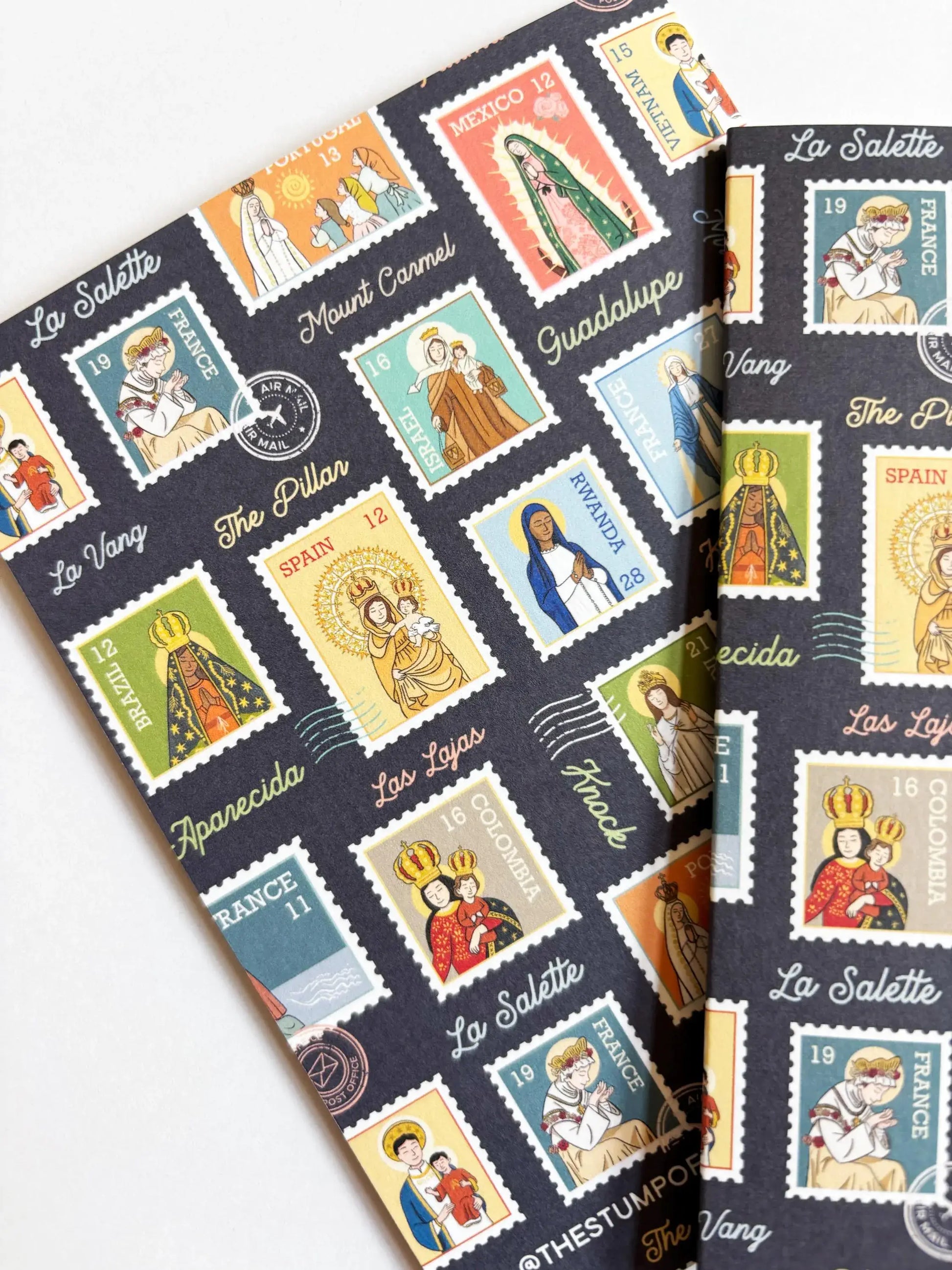 From the miraculous appearances in Lourdes, Fatima, and Guadalupe to lesser-known but equally significant sites like La Salette, Knock, and Mount Carmel, each "stamp" is a miniature work of art, rich in detail and spiritual meaning. The deep navy background highlights the vibrant colors of each individual illustration, creating a captivating and reverent design.