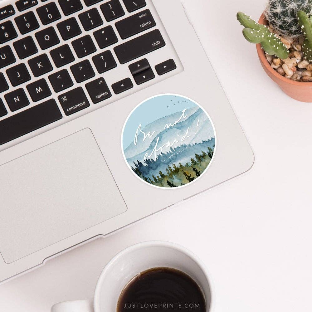 "Be not afraid!" These words were spoken by St. John Paul II, and the text in the design is written in his actual handwriting! Put these waterproof vinyl stickers on your water bottle, laptop, phone, notebooks, or car!