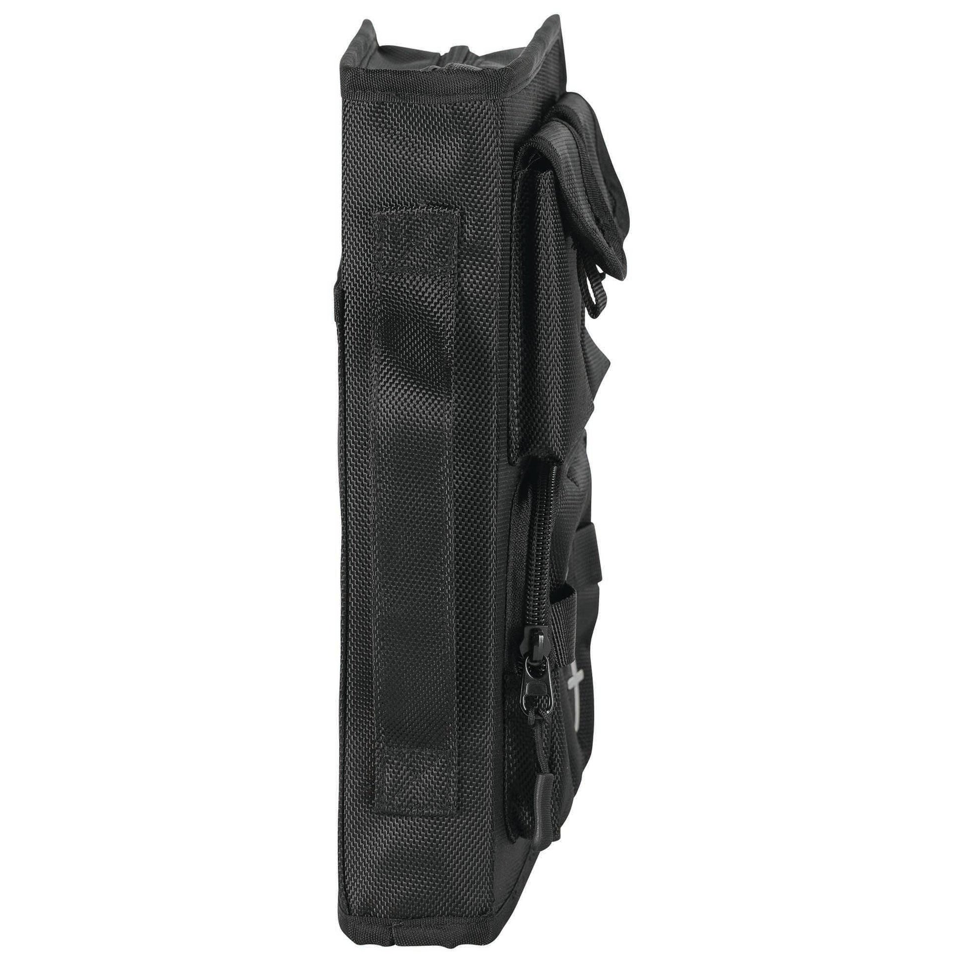 Portfolio style Bible cover is made of rugged polyester ballistic fabric that's very durable and water resistant, with nylon reinforced stitching. Hardboard sides give it a briefcase appearance and provide extra protection. Open pocket on back and three pockets on front: two are 3" x 4" with flaps and velcro fasteners; great for coins, keys etc. One is 5" x 6" with zipper closing; perfect for smaller phone or a wallet. Front of pocket has silver metal cross accent. Zipper around side is two-way and finished with spoon style cross pulls. It's also non-rusting and self-repairing. Side carrying handle. Lay flat construction allows easy reading and study. There's also a pen loop and attached ribbon bookmark inside. The Large size will hold a Bible or book up to about 6 3/4" x 9 1/2" x 2".
