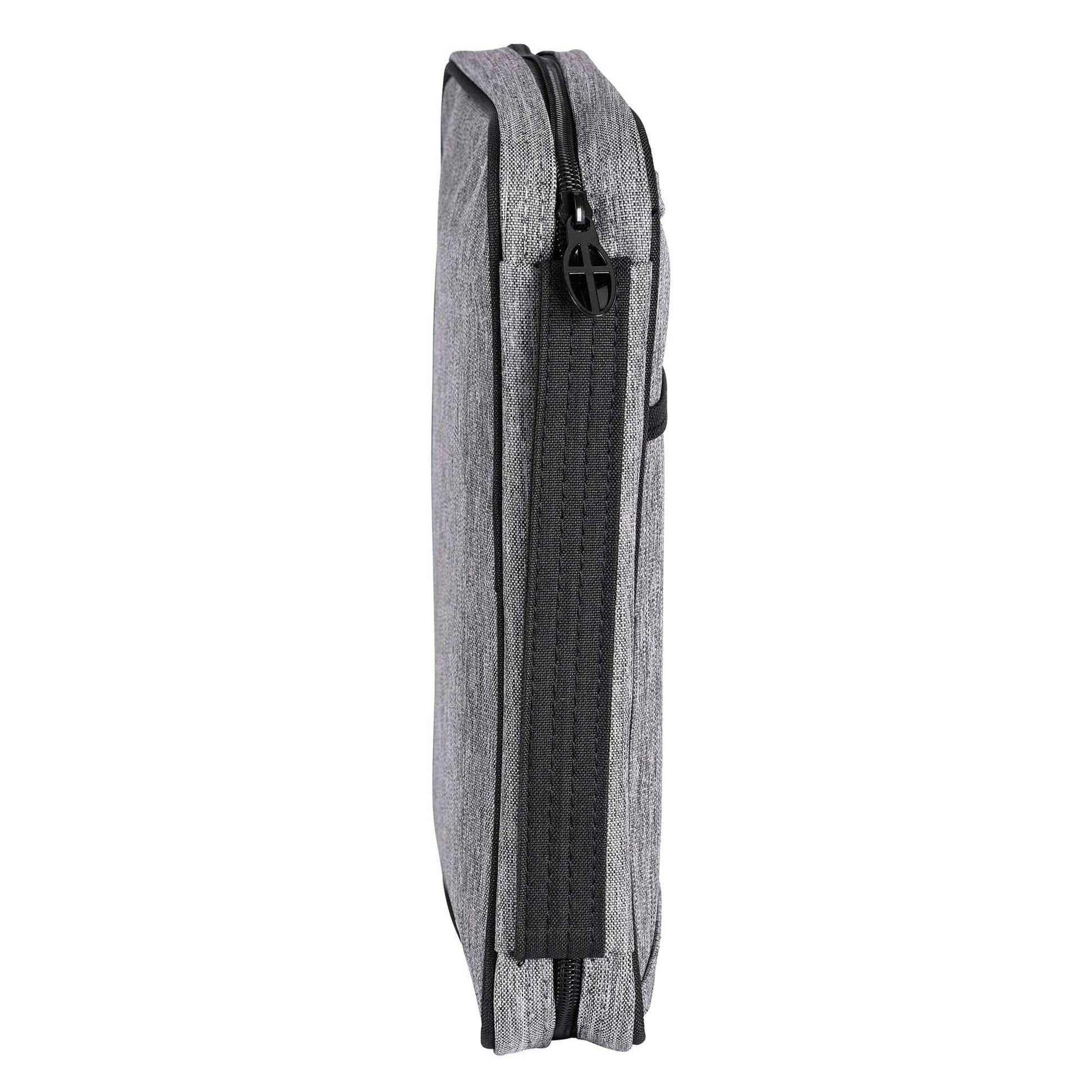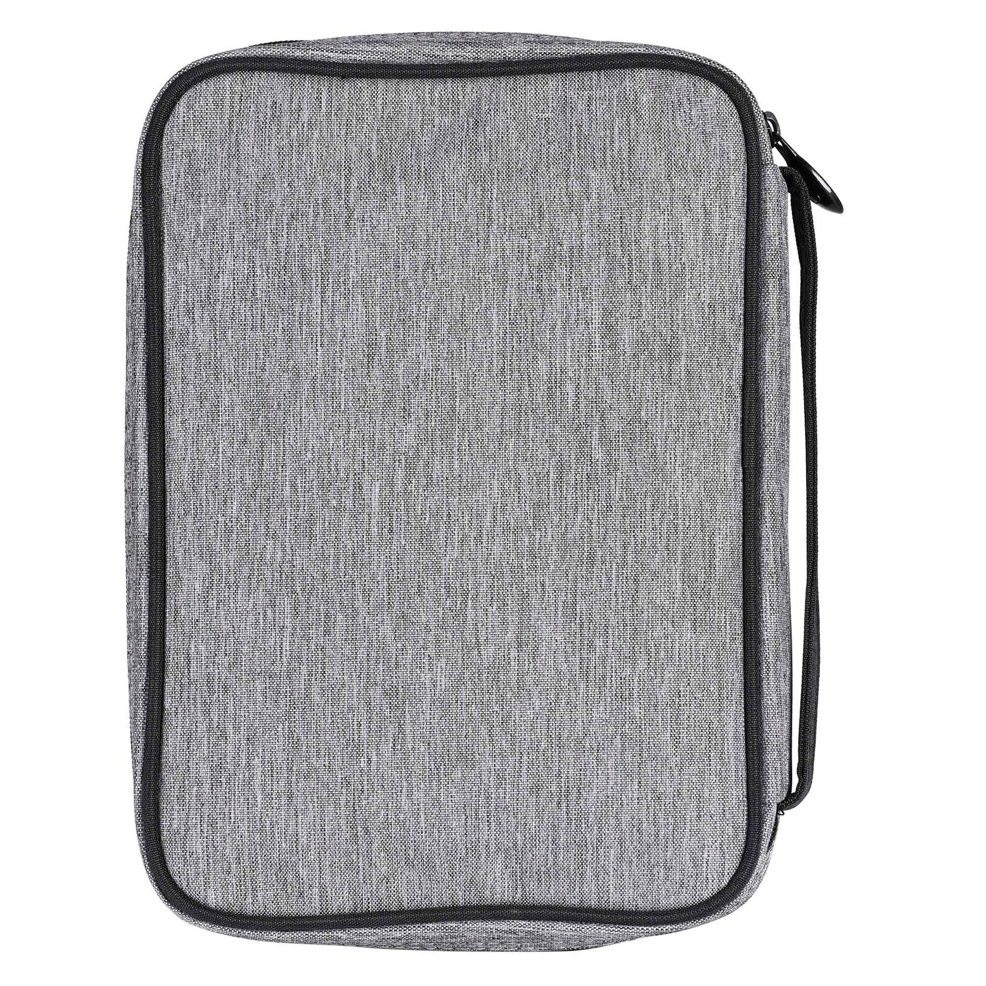 This Gray Fabric Bible Cover With Black Trim Has A Sturdy 600 Denier Canvas Look Polyester With Nylon Reinforced Stitching. Non-Rusting And Self-Repairing Side Zipper With Spoon-Style Cross Zipper Pull. Front Pocket And Carrying Handle At Side. Cover Lays Completely Flat When Open; Inside Is A Loop For Your Pen And An Attached Ribbon Bookmark. The Large Size Holds A Bible Or Book Up To About 7 1/8 x 2 x 10 1/4. Black Embroidered Cross In Lower Right Corner.