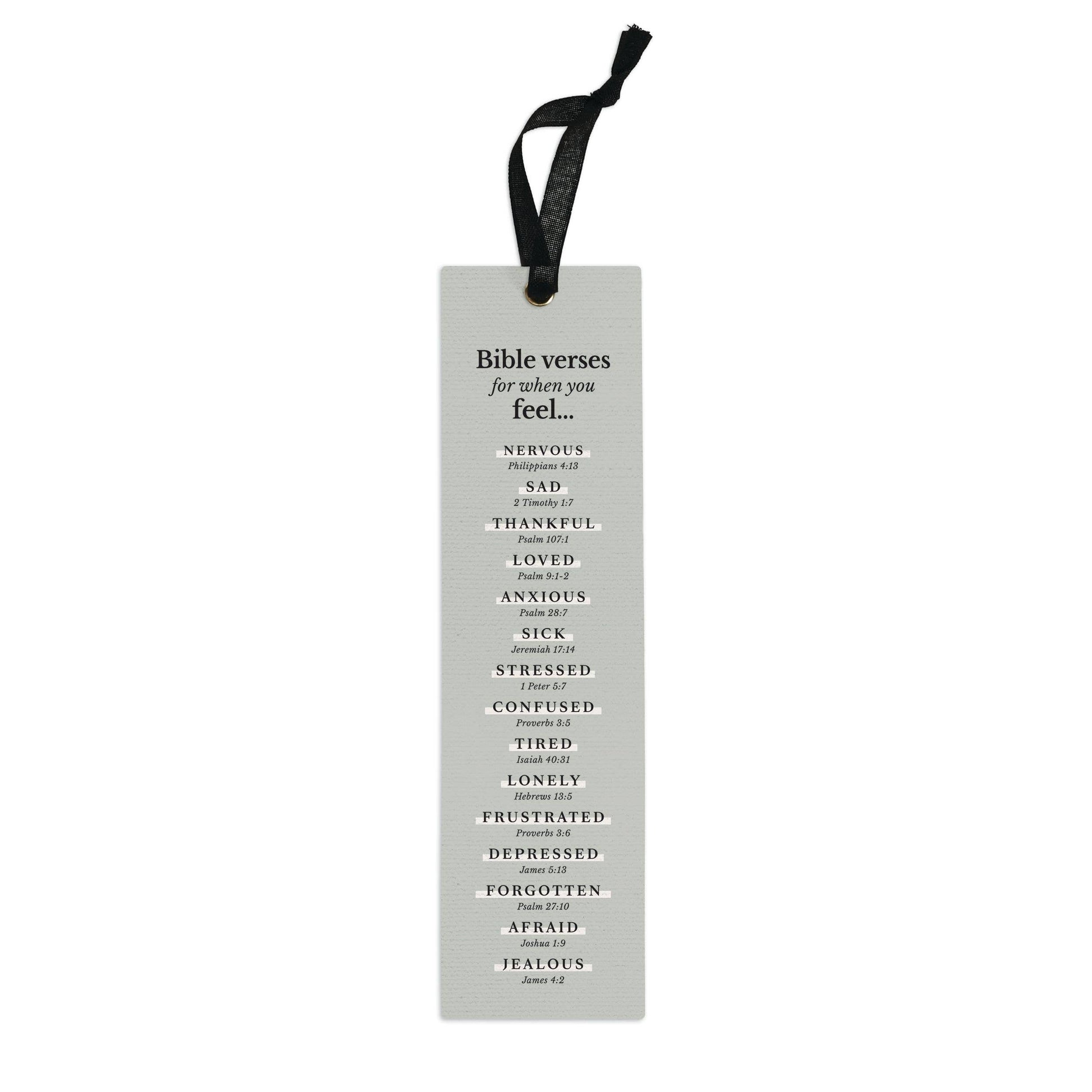 These soft, textured linen bookmarks are designed with messages of faith and artistic embellishments. Includes a black satin ribbon looped through a grommet.