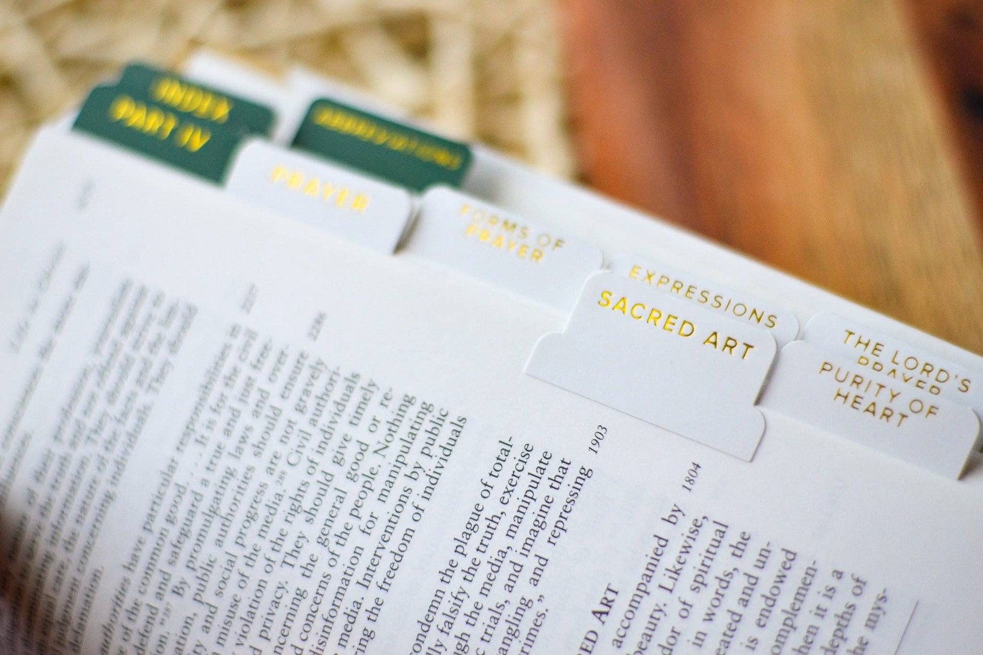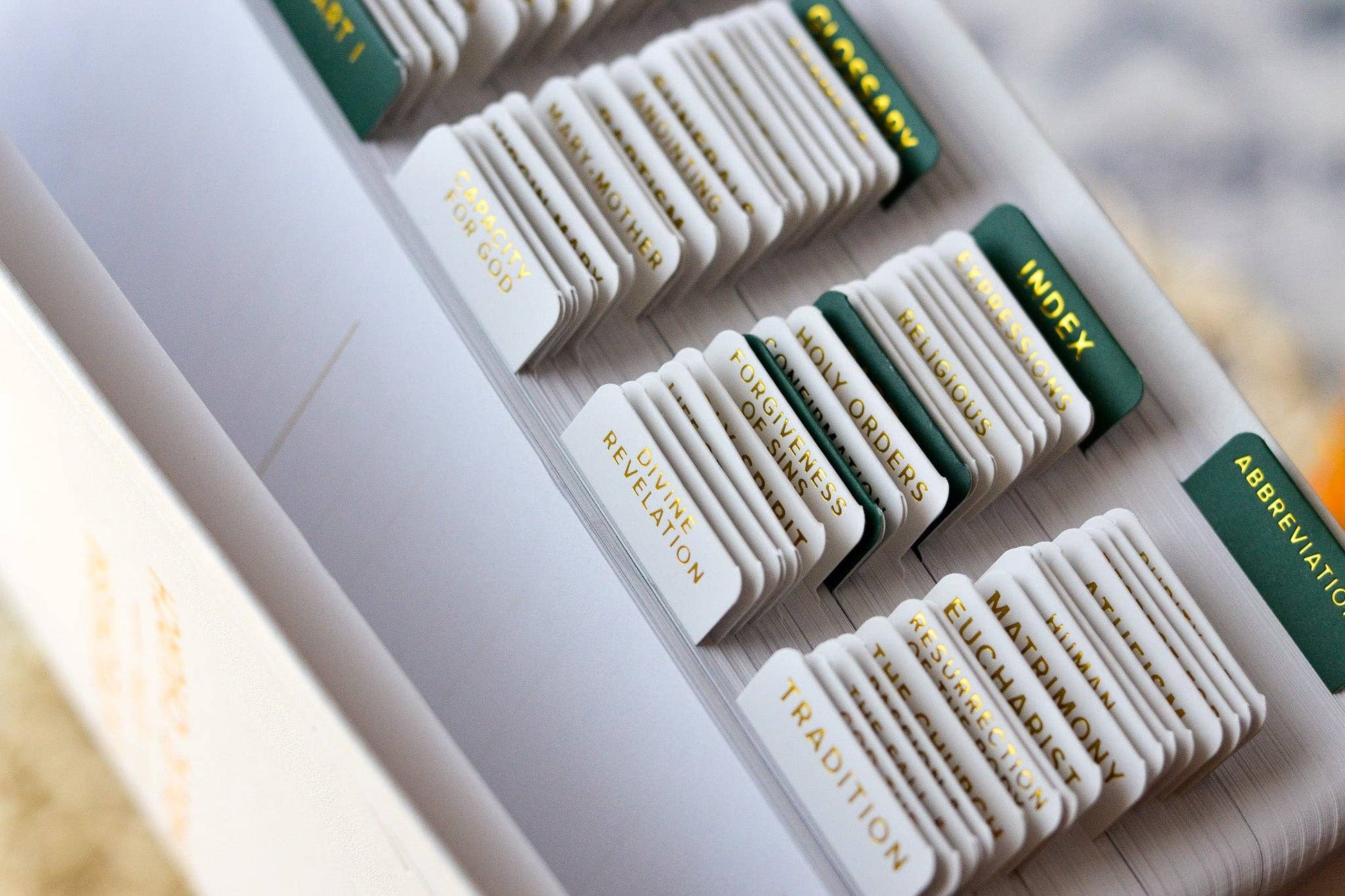 Our Catechism tabs are not only practical, they are luxurious and beautiful featuring legible gold lettering. All reference topics are in cream color while special sections are contrasted in dark emerald green.