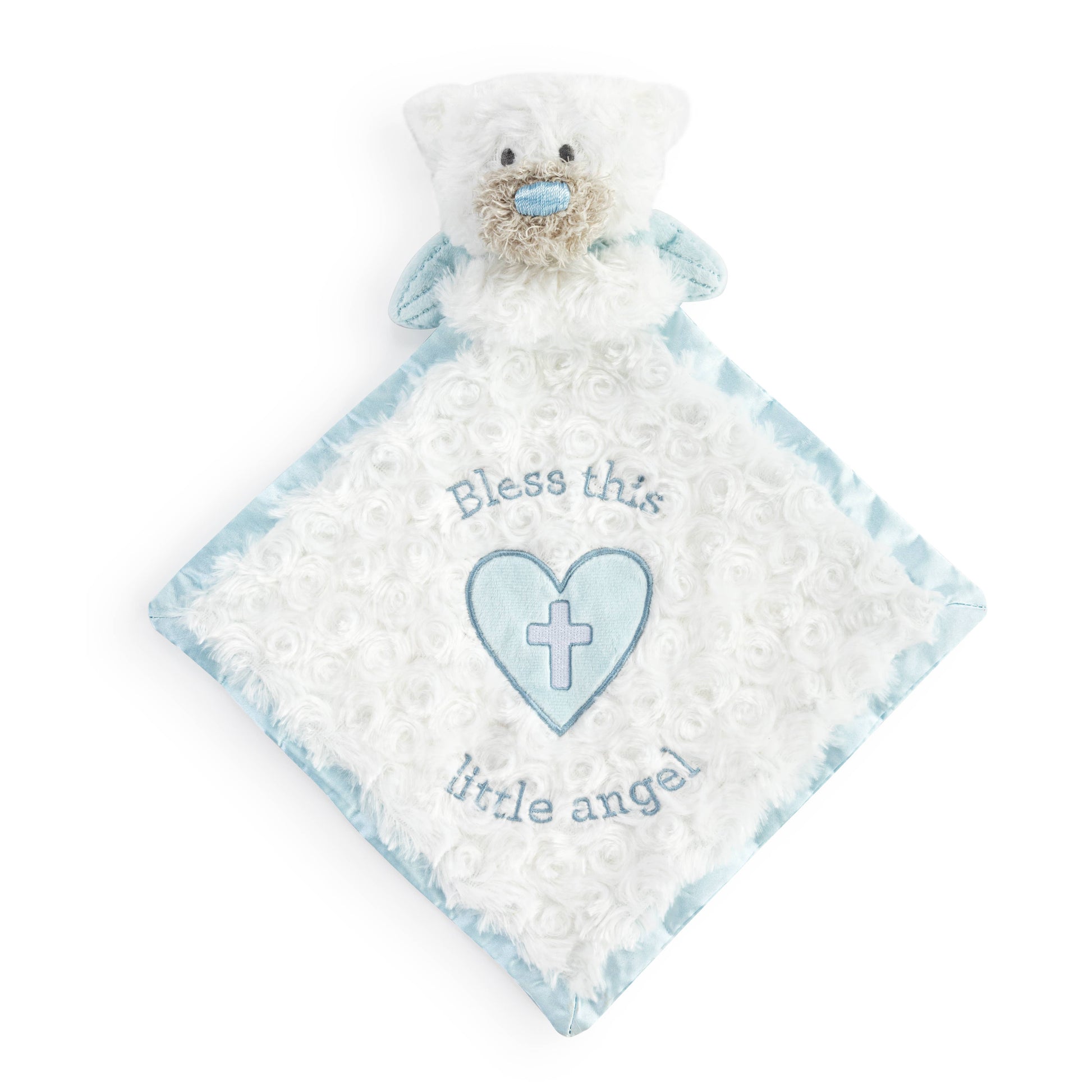 Cuddle up with the Guardian Angel Bear Blankie-Blue. This adorable baby blanket has a special sentiment on it that reads: Bless this little angel.