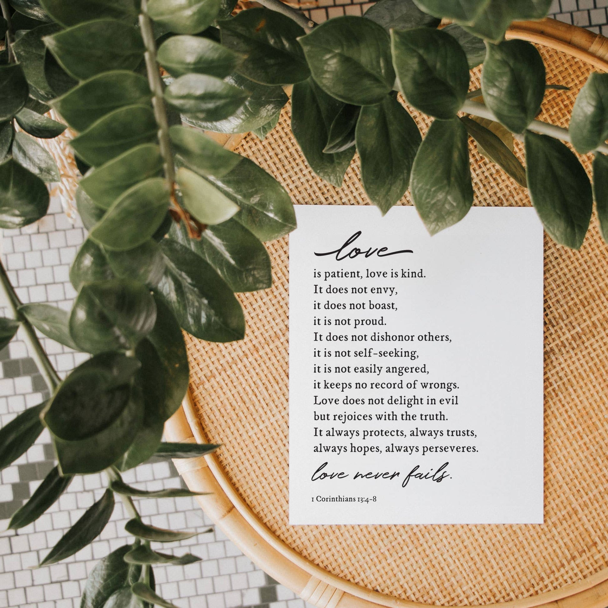 Love is patient, love is kind. It does not envy, it does not boast, it is not proud. It does not dishonor others, it is not self-seeking, it is not easily angered, it keeps no record of wrongs. Love does not delight in evil but rejoices with the truth. It always protects, always trusts, always hopes, always perseveres. love never fails. 1 Corinthians 13:4-8