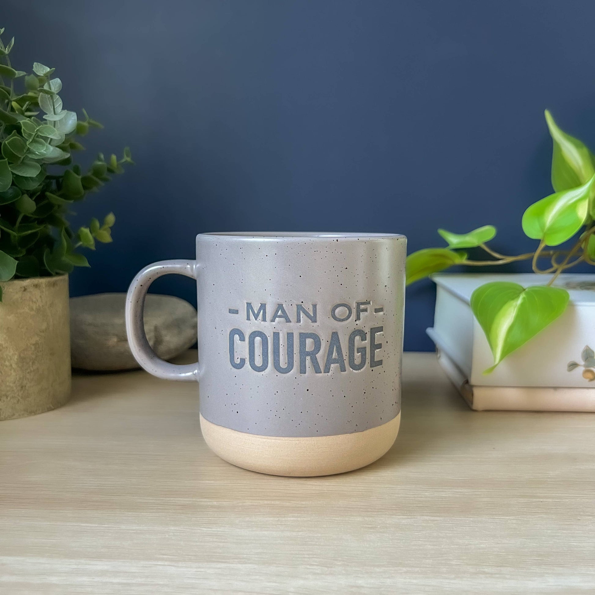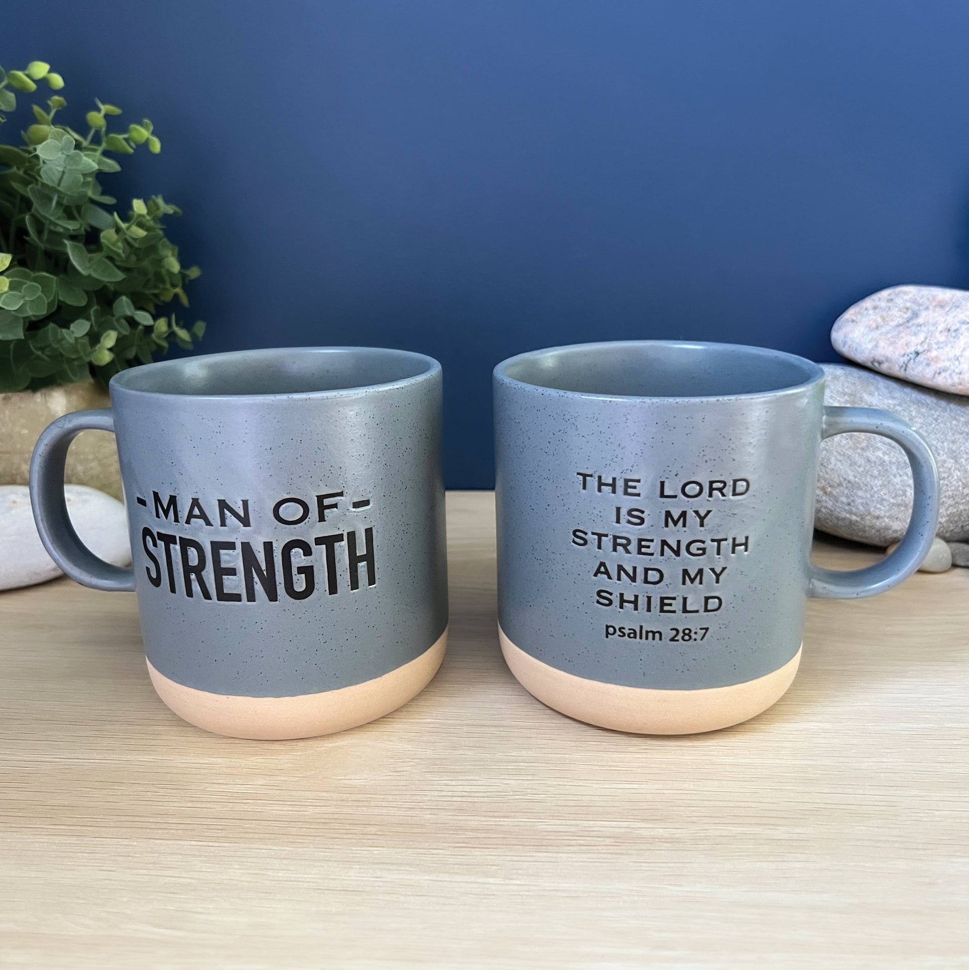 Mugs with light speckle glaze and raw bisque bottom, featuring wax resist messages for men. Microwave and dishwasher safe. 4"H x 4"D. Holds 20 oz.