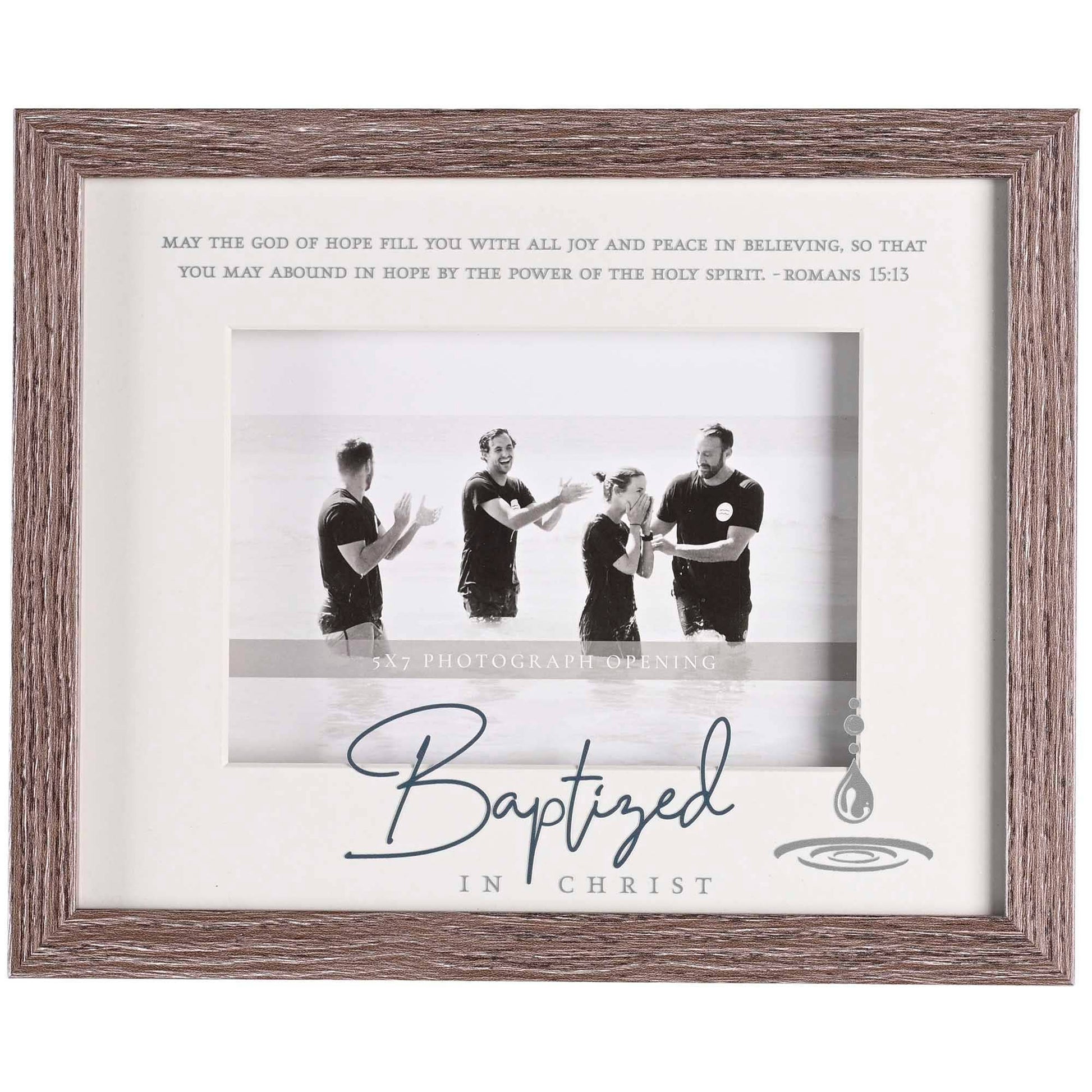 Shadow Box Style Photo Frame Features Text: Baptized In Christ; Along With Romans 15:13: May The God Of Hope Fill You With All Joy And Peace In Believing, So That You May Abound In Hope By The Power Of The Holy Spirit. Text And A Watermarked Water Droplet Are Printed On The Underside Of Glass That Sits 3/4 Above A White Matboard For Your 7x5 Photo. Wood Grain Frame Is MDF Wood. Window Size Is 10 x 8; Outer Frame Size Is 11 x 9. Removable Back Includes Pull-Out Easel Plus Hanging Hooks For Either Tabletop Or Wall Display. Assembled in the US of imported materials.