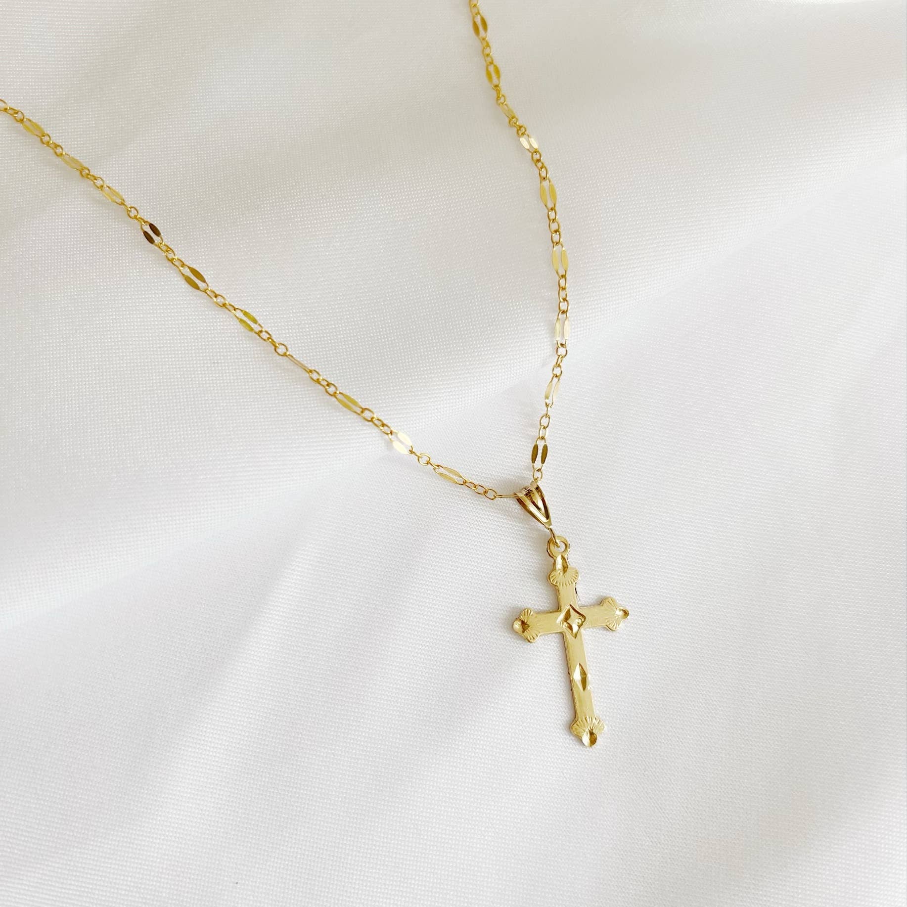 Diamond cut cross pendant strung on dainty high-quality chain. Available in 14k gold filled or sterling silver.