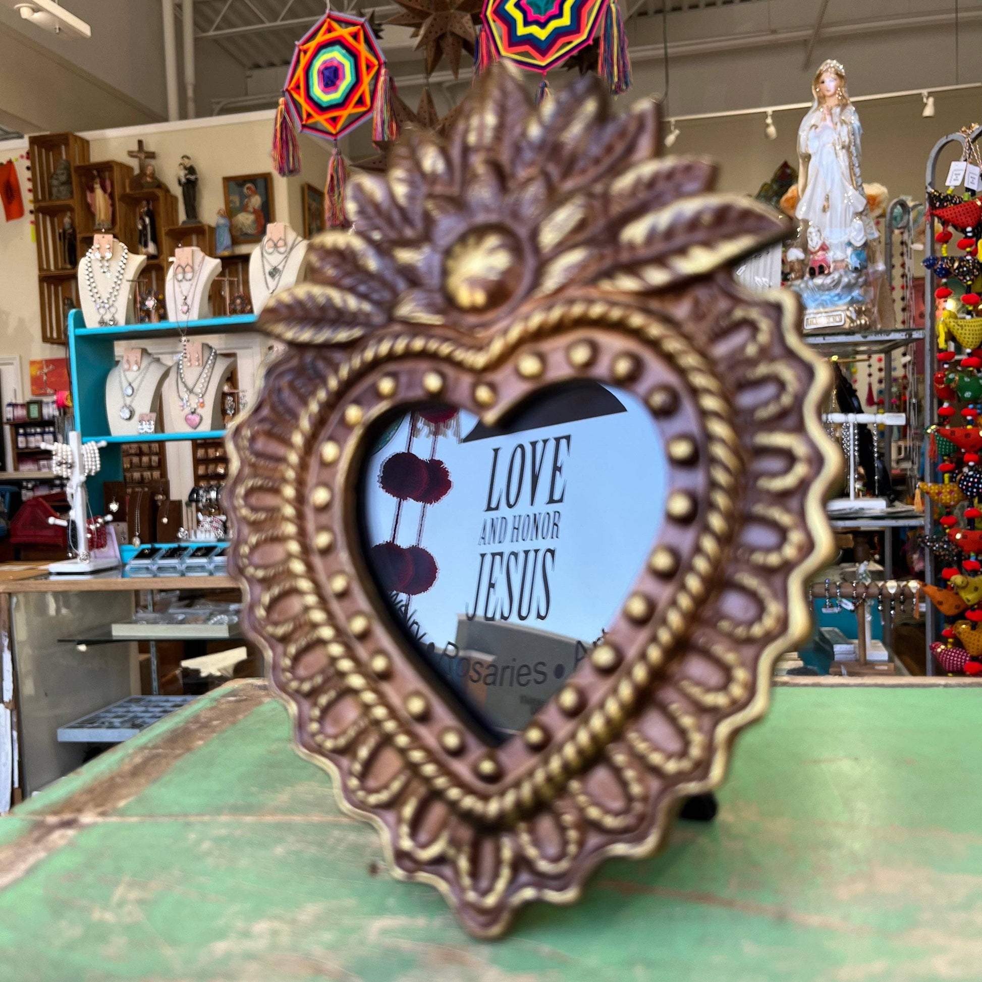 5x7 Sacred Heart Standing Frame fits 3x3 picture. Made of aluminum. Made in India. Antique Gold color.