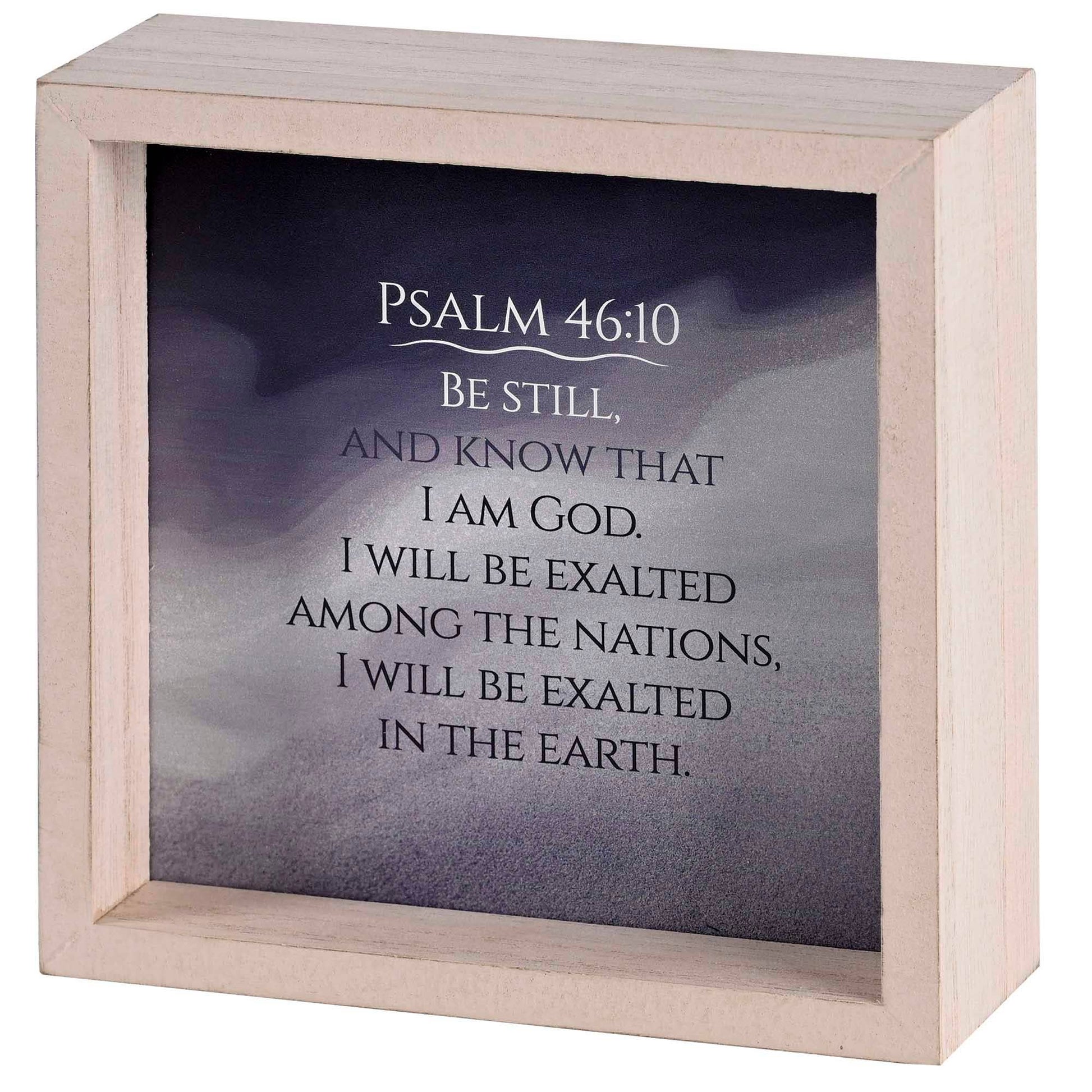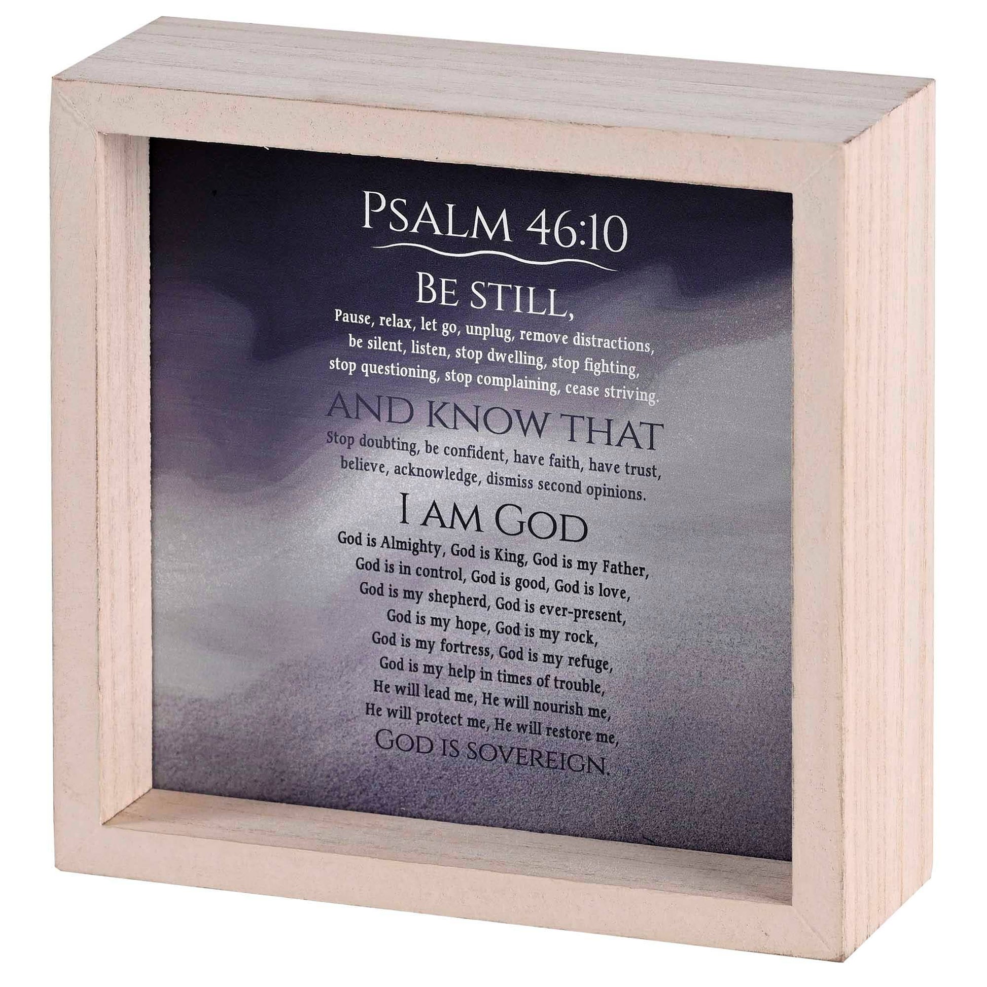 A Tabletop Art Piece Showcasing On One Side, A Word Study On Psalm 46:10: Be Still (Pause, Relax, Let Go, Unplug, Remove Distractions, Be Silent, Listen, Stop Dwelling, Stop Fighting, Stop Questioning, Stop Complaining, Cease Striving) And Know That (Stop Doubting, Be Confident, Have Faith, Have Trust, Believe, Acknowledge, Dismiss Second Opinions) I Am God (God Is Almighty, God Is King, God Is My Father, God Is In Control, God Is Good, God Is Love, God Is My Shepherd, God Is Ever-Present, God Is My Hope, God Is My Rock, God Is My Fortress, God Is My Refuge, God Is My Help In Times Of Trouble, He Will Lead Me, He Will Nourish Me, He Will Protect Me, He Will Restore Me, God Is Sovereign). The Other Side Displays The Entire Verse Of Psalm 46:10: Be Still, And Know That I Am God. I Will Be Exalted Among The Nations, I Will Be Exalted In The Earth.
