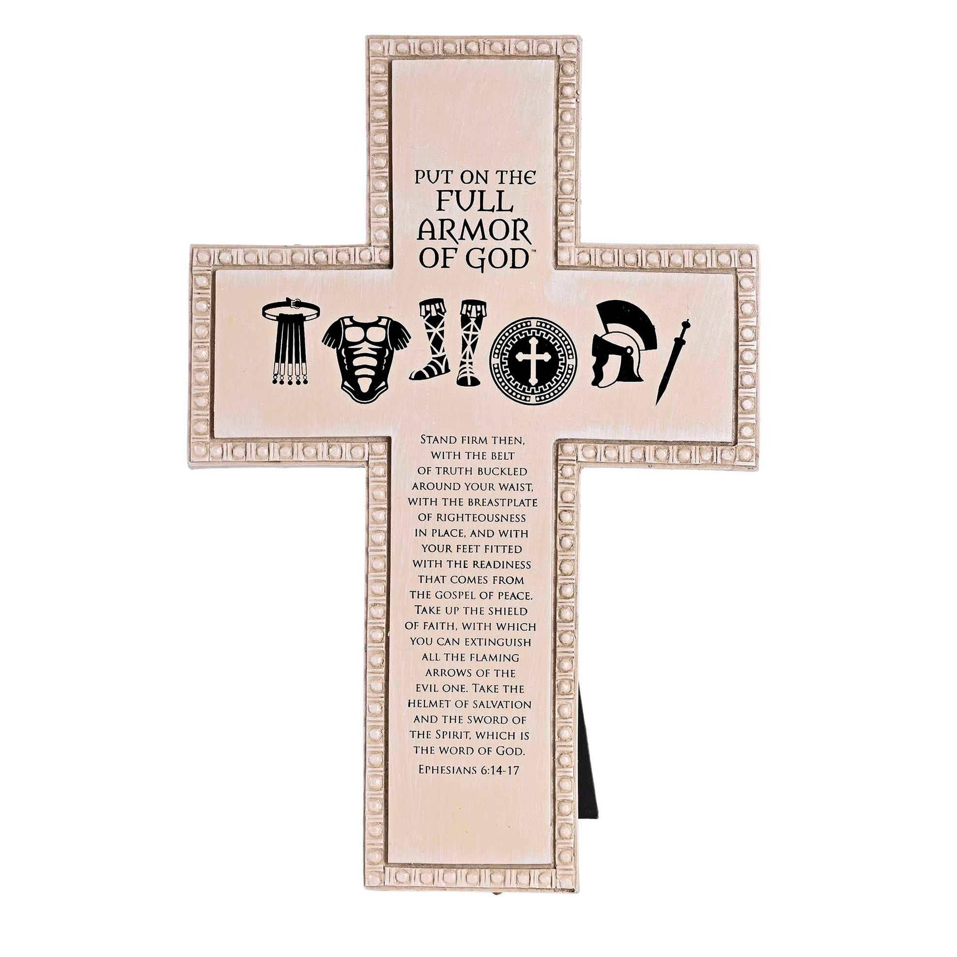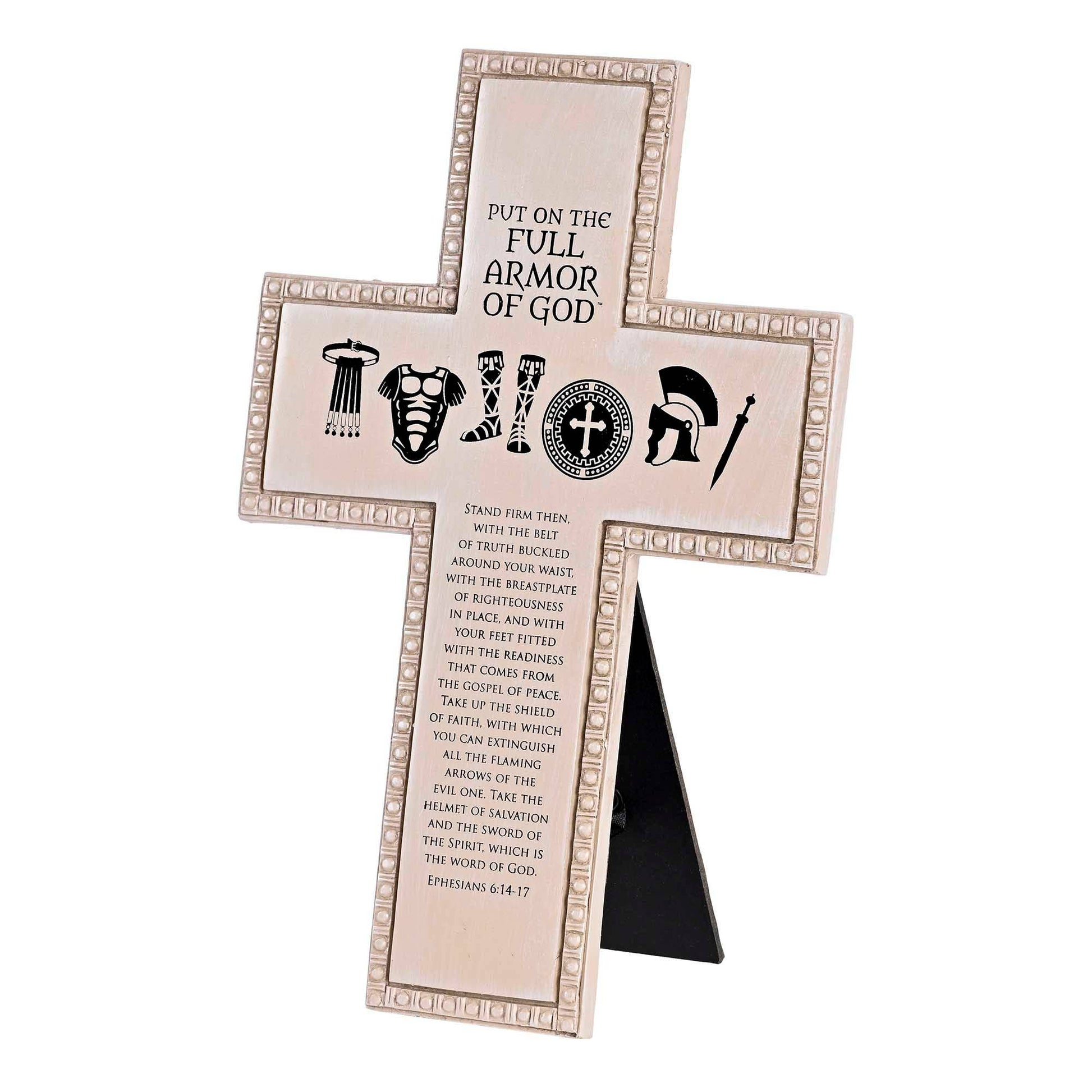 A Magnificent Tabletop Cross Intricately Embellished With Scripture, Showcases Exquisite Details. Standing At A Height Of 10 Inches And Crafted In An Elegant Wood-Tone, This Piece Serves As A Remarkable Addition To Any Tabletop Decor Using The Attached Easel Or Can Be Hung With The Attached Wall Hook. Made Of Resin. Ephesians 6:14-17: Stand Firm Then, With The Belt Of Truth Buckled Around Your Waist, With The Breastplate Of Righteousness In Place, And With Your Feet Fitted With The Readiness That Comes From The Gospel Of Peace. Take Up The Shield Of Faith, With Which You Can Extinguish All The Flaming Arrows Of The Evil One. Take The Helmet Of Salvation And The Sword Of The Spirit, Which Is The Word Of God. Comes Packed In A White Or Brown Box.