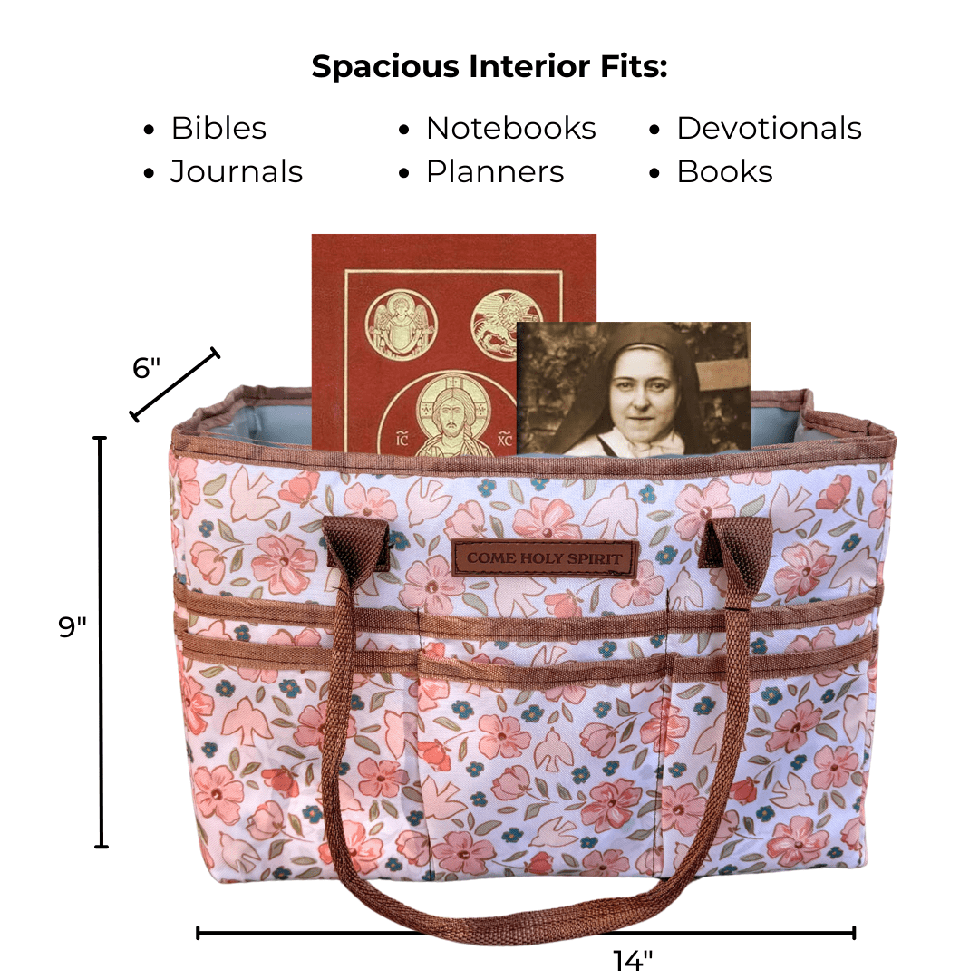 Create a peaceful, prayerful space—anywhere in your home. Our Prayer Corner Caddy is thoughtfully designed to help you organize your faith essentials with beauty and function. Whether you're setting up a quiet prayer nook, bringing supplies to Bible study, or keeping your family's devotionals in one place, this floral caddy is your go-to solution. This caddy features18 exterior pockets for easy access to small items like prayer cards, pens, or rosaries, and a spacious open interior to hold larger items like Bibles, journals, and books. It’s easy to carry with durable double handles and is finished with a stitched faux leather patch that reads “Come Holy Spirit”—a gentle and beautiful reminder of who leads our hearts and homes. The soft floral pattern adds a touch of charm, making it a lovely addition to any sacred space. Perfect for moms, catechists, or anyone wanting to keep their prayer life a little more organized and a lot more lovely.