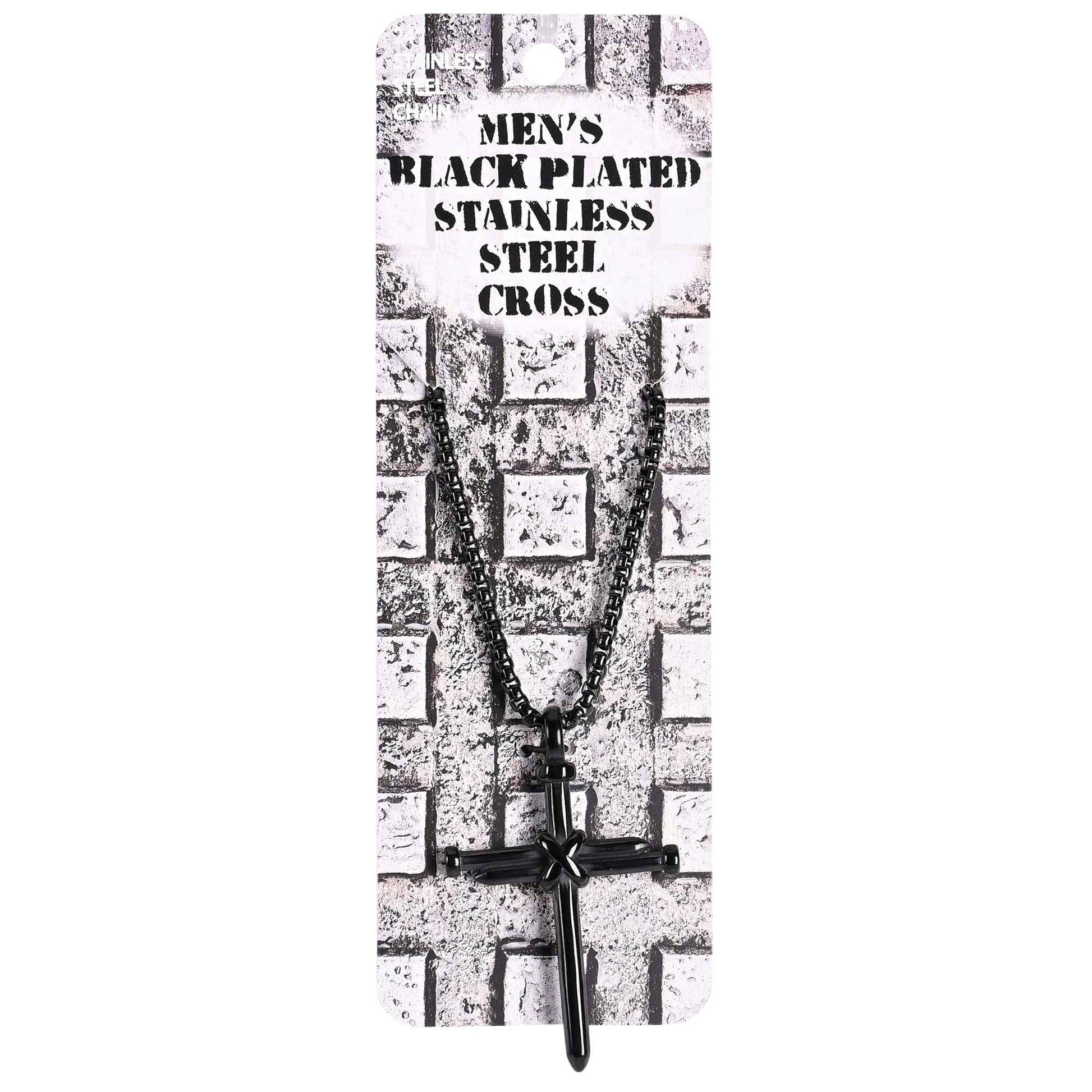 Mens Cross With Black Plating. 3-Nail Cross Is 1-7/8 Long. Black Plated 24 Inch Stainless-Steel Pearl Chain With Lobster Claw Clasp. Comes Carded.