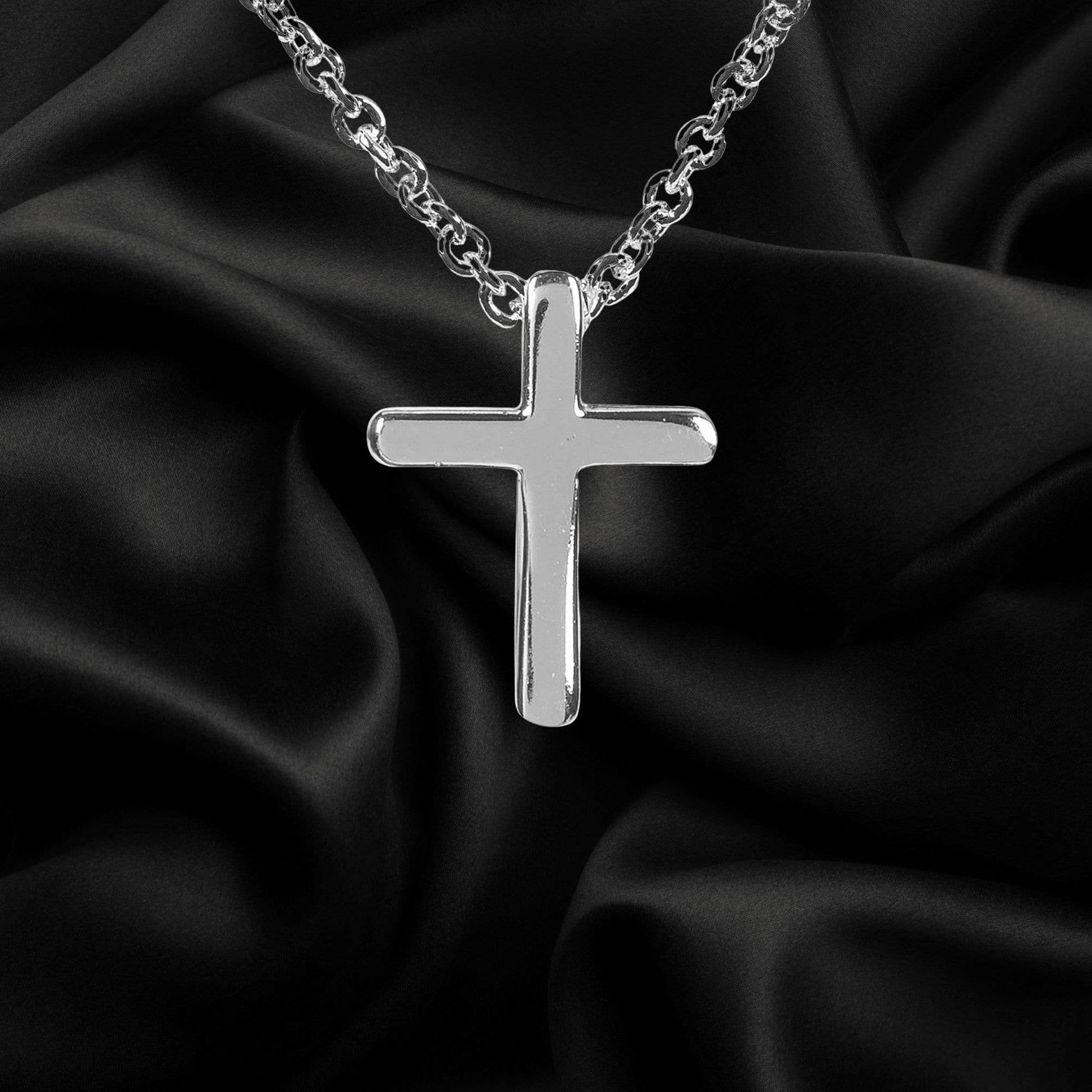 Mini silver plated box cross has a hidden bale for the 16" silver plated chain. Cross length is 7/16". Necklace comes in a deluxe black gift box.