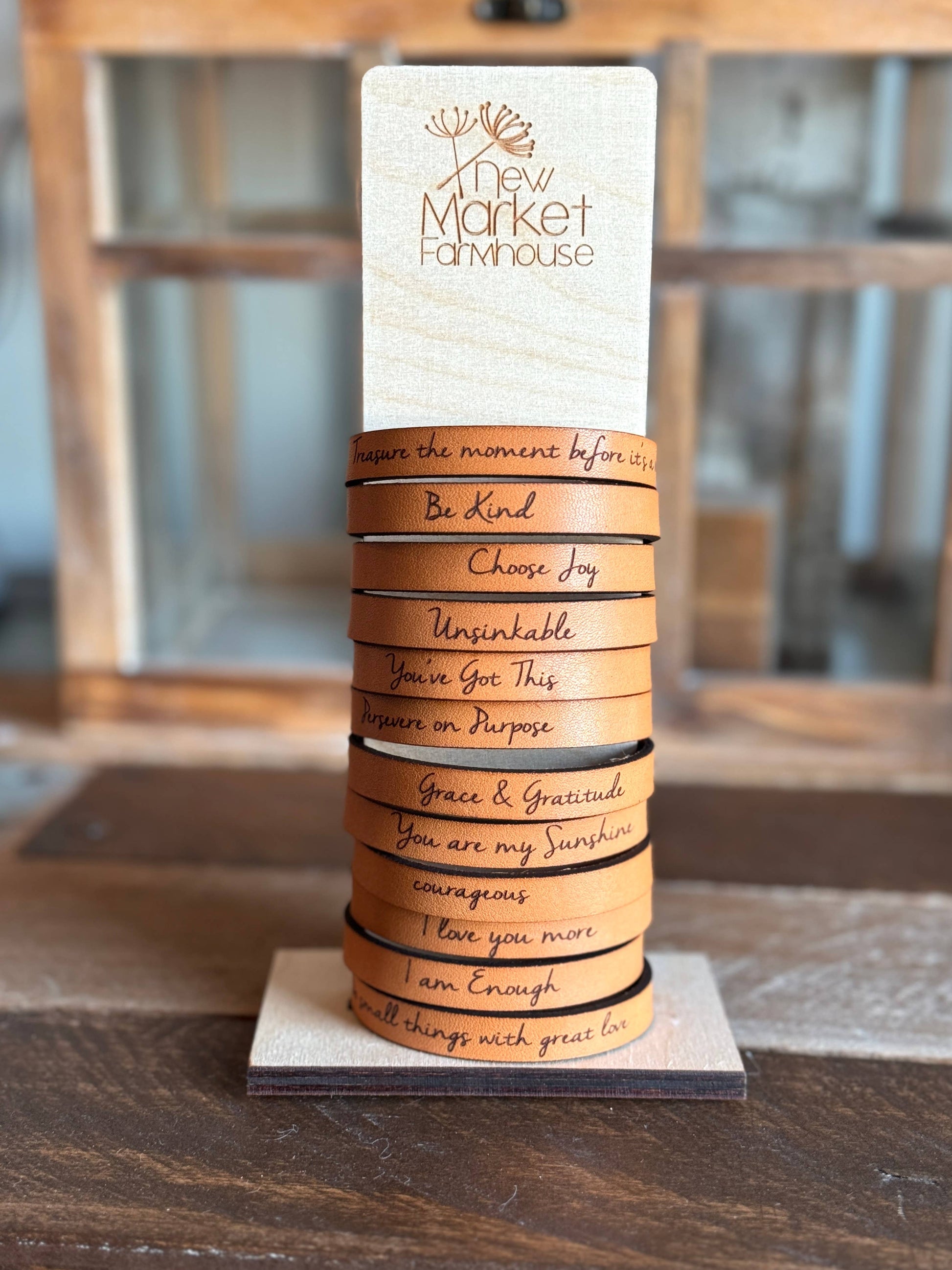 Made from full grain leather from our local leather shop. We personally cut and engrave each bracelet. Closure is a button stud, and adjustable.