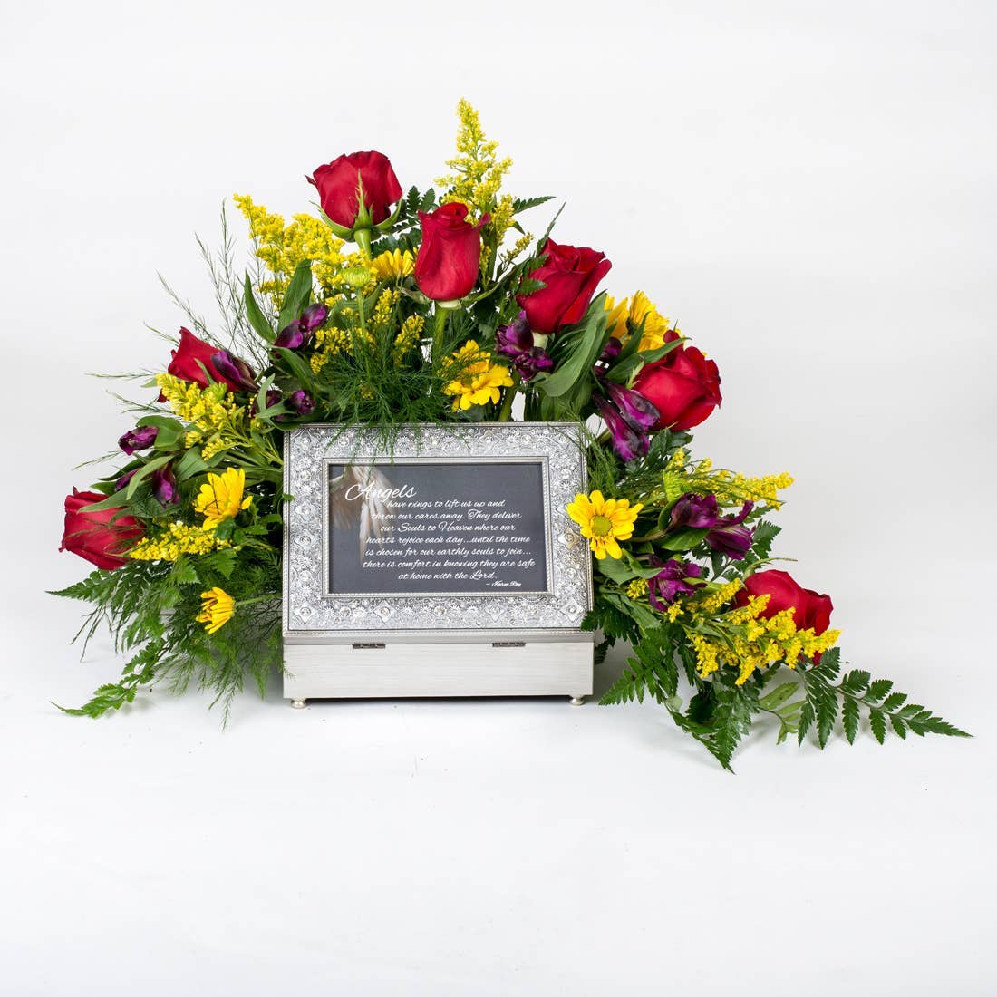Silver Tone Jeweled Music Box in champagne silver tone finish. Beaded jewels frame the hinged lid. Jewelry box measures approximately 8 x 6 x 2.75 inches; Window opening hold 4 x 6 inch personal photo. Black velvet lined interior; Decorative bun feet are padded to protect table top and shelf surfaces. Great for floral arrangements; Individually boxed.